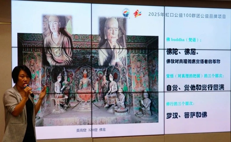 活動(dòng)伊始,老師為大家揭開了“敦煌”之名的由來,講述了莫高窟開鑿的傳奇故事與近代敦煌文物的發(fā)現(xiàn)歷程。隨著講解的深入,一座座恢弘的洞窟、一尊尊莊嚴(yán)的佛像栩栩如生地呈現(xiàn)在大家眼前。